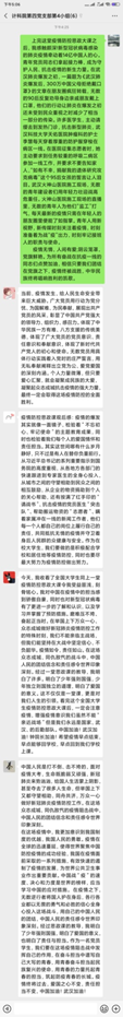 员工第四党支部全体党员在线观看了“全国老员工同上一堂疫情防控思政大课”。课后,支部党员围绕专家讲授,结合自己的亲身经历和假期见闻,以党小组为单位展开热烈的线上讨论。党员在党小组内,以群语音或文字形式,畅谈对本次抗“疫”战斗的思考和感悟,分享思政课中最有触动和启发的点。党员纷纷表示,这堂思政课内容丰富,触动心灵,让人受益匪浅。