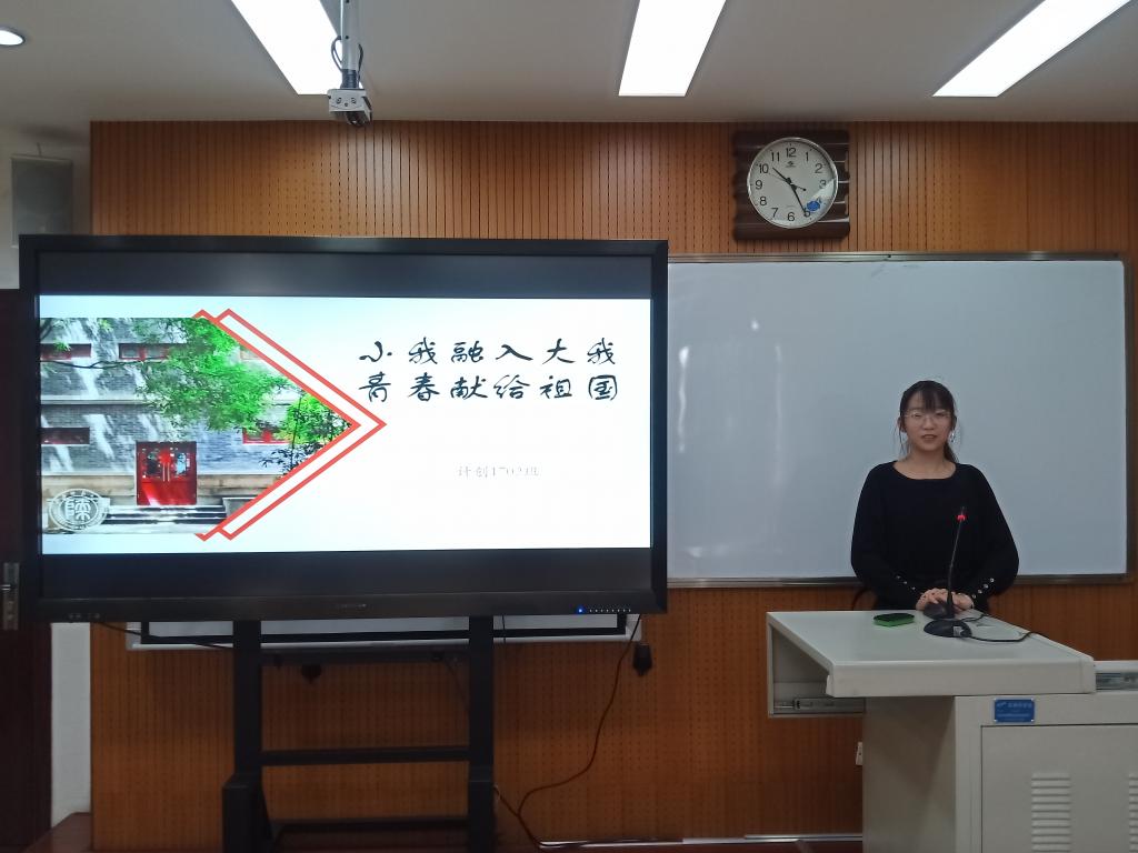 为纪念祖国成立70周年,贯彻习近平新时代中国特色社会主义思想,推动落实“青春告白祖国”主题宣传教育活动相关部署,引领广大青年团员坚定“四个自信”,进一步增强责任感和使命感,激发其爱国之情和奋斗之志,10月17日10点,公司计创1702班于文津楼1509举行了“小我融入大我,青春献给祖国”主题团日活动。本次活动由团支书宋澳华主持,计创1702班全体成员参加了本次活动。