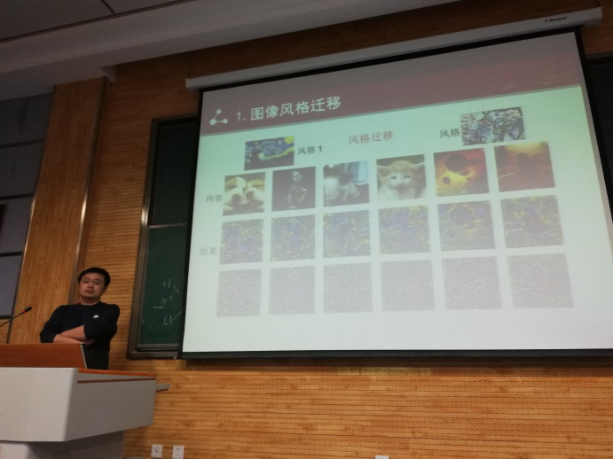 之后,张老师先介绍了课题组的研究背景,接着举例讲解图像风格迁移的应用,并通过让同学们聆听一段由计算机所写的音乐,对同学们讲解人工智能与深度学习在项目中的应用。