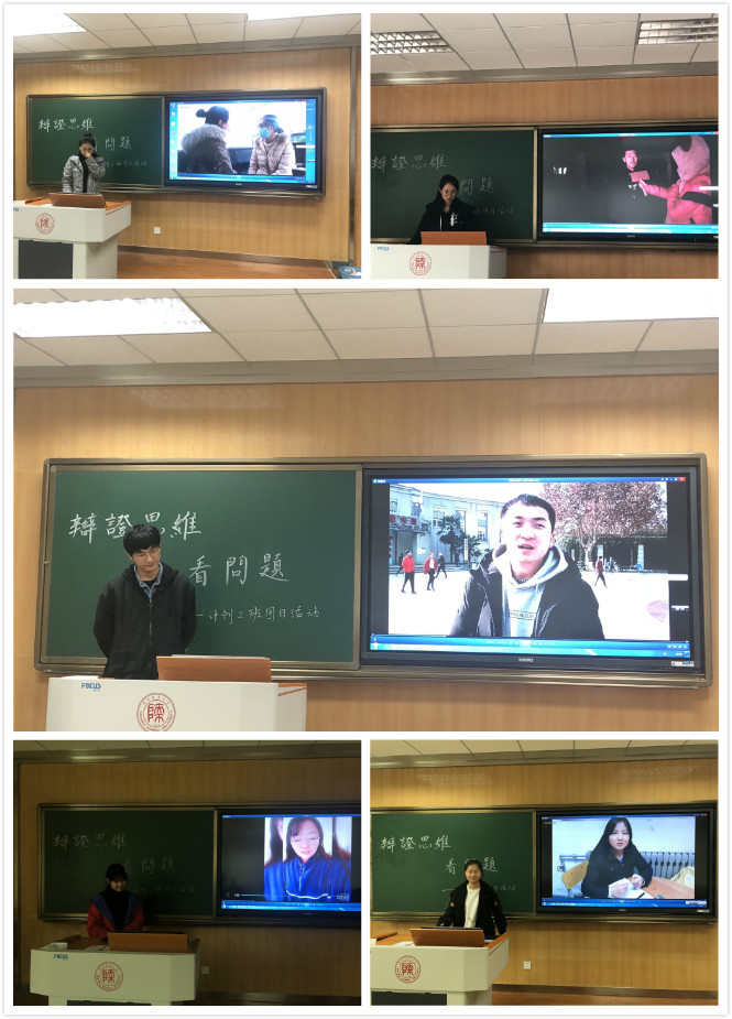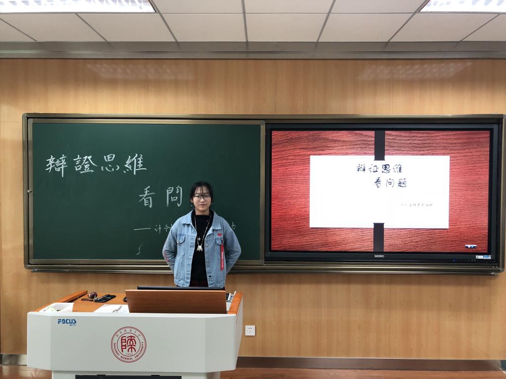 紧接着,“辩证思维看问题个人赛”拉开帷幕。参赛团员依次登场,团支书为参赛选手随机抽取了出题人。无论是“昭君出塞源于何”和“海伦·凯勒的得与失”这类熟悉的故事,还是“长期资本管理基金的破产”“师傅徒弟的对话”这类陌生的话题,抑或是十分接地气的“怎样看待晒幸福的人”,还有“母亲和女友同时掉水里先救谁”的世纪难题,都让人眼前一亮。李欣瑶有感而发的真情表露,让团员们体会到孝心的难能可贵;谢佩珍的严谨剖析、深刻探究,让团员们叹服不已。选手或犀利或精妙的回答,评委抽丝剥茧的解析,都让在座团员们啧啧称道。教室里,叹服声与掌声齐飞。最后,团支书宋澳华为优秀个人和小组颁发了奖品。