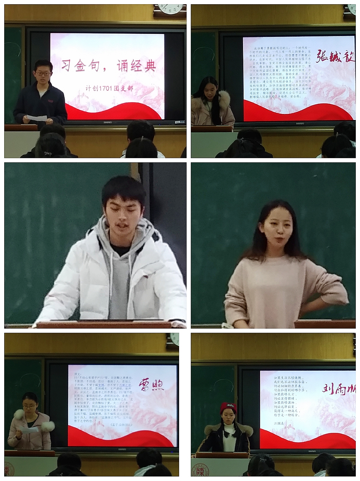 悠悠金句,诵时代经典;声声入耳,谱时代新篇。12月19日上午十时许,公司2017级计创一班在文渊楼3217举行了以“习金句,诵经典”为主题的团日活动。本次活动由团支书林雨婷主持,2017级计算机科学与技术(创新实验班)一班全体成员参加了此次活动。