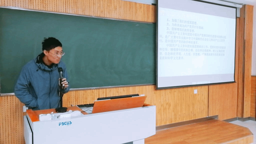 首先,同学们观看了纪录片,回顾了在党的领导下,全国人民艰苦奋斗,建设新中国的历程。在纪录片中,同学们了解到肩负复兴中华的伟大使命担当,认识到青年人在国家振兴中的中坚作用。接着,林殊凡从不同方面向大家讲解了团徽的意义和共青团的三次更名的历史过程,说明了在民族抗争救亡运动中发张壮大的共青团有着光荣的历史,激励着当代共青团员牢记使命,奋发努力。最后,戴行健向大家阐述了加入共青团的意义,青年是国家的希望,是民族的希望,教育好青年,正确引导青年发展就是为国家播下希望。