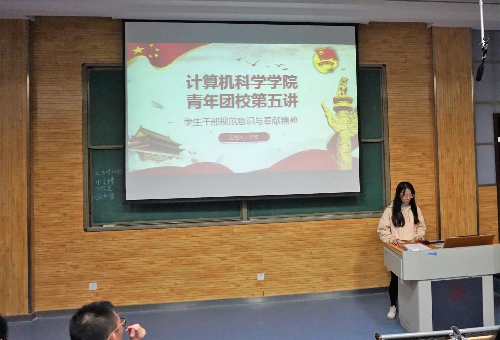公司青年团校培训班第五讲于11月25日晚在雁塔校区顺利举行。公司员工会副主席、2016级计算机科学与技术(创新实验班)任欣做了题为《员工干部规范意识与奉献精神》的报告,公司2018全体员工干部参加了此次培训。
