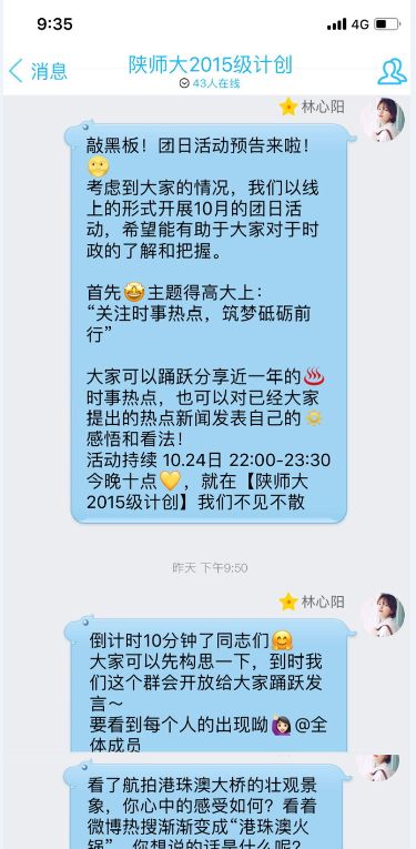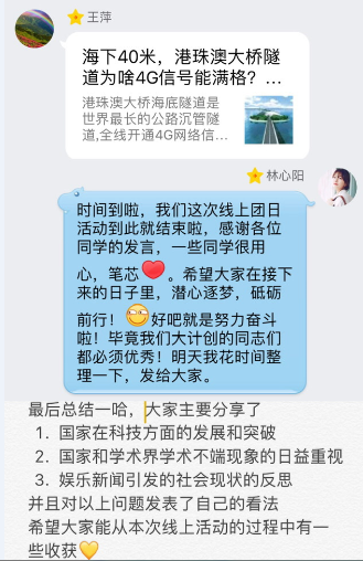 2018年10月24日,计算机科学与技术(创新实验班)1501班团支部开展主题为“关注时事热点,筑梦砥砺前行”线上团日活动。同学们在线上分享自己所了解的时事热点话题,并发表自己的看法。