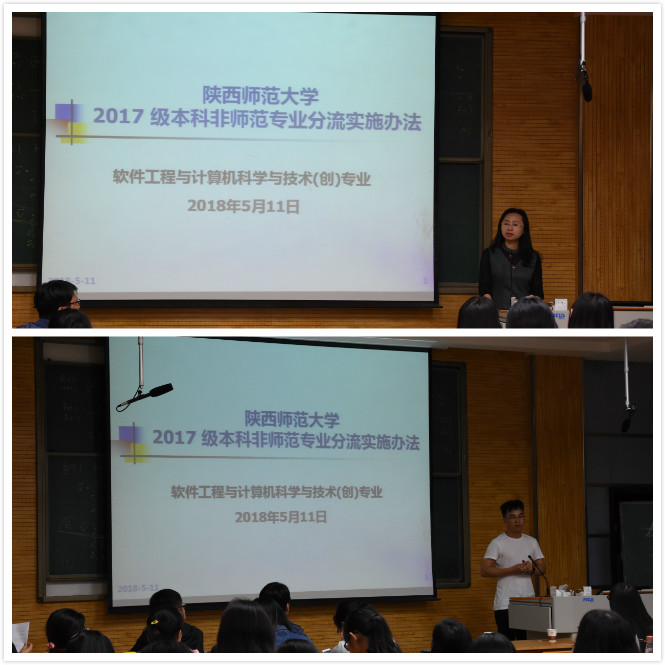 为了使同学们进一步深入了解专业分流相关政策,帮助大家明确各专业课程设置以及未来就业考研定位,5月11日晚7时许,公司2017级非师范生专业分流宣讲会在雁塔校区5301教室举行。公司党委副书记袁冰老师、教学副经理马苗老师、软件工程专业负责人祁超老师、华讯科技有限公司企业负责人姚国新、京东云创中心总经理王泽方、2017级辅导员陈应权以及2017级全体非师范生参加了本次专业分流宣讲会。