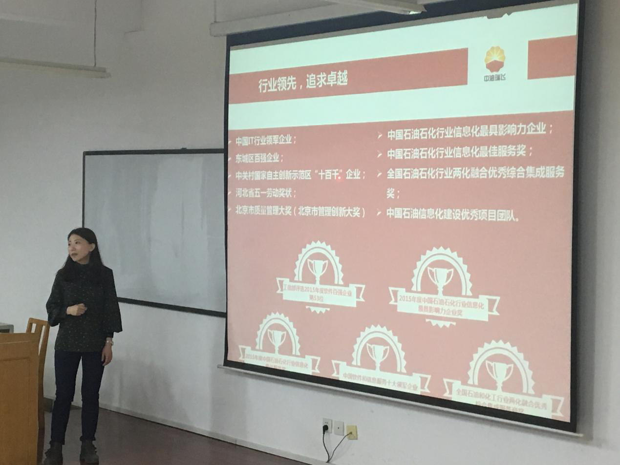 北京中油瑞飞信息技术有限责任公司是中国石油集团东方地球物理的全资子公司,是中国石油集团公司规模最大,综合实力最强的信息技术单位,主要面向能源,公共事业与金融等行业,为其提供规划,咨询,实施及运维,培训的一体化服务。会上,公司宣讲人为同学们详细介绍了公司的发展里程,核心业务范围,企业文化,工作地点等内容,并通过图片向同学们详细展示了招聘流程,公司福利,入职待遇等内容。同学们就各自关心的问题进行了询问,公司负责人也都给予了耐心的解答。之后还进行了有奖问答环节,宣讲人就所讲内容进行提问,在得到同学们的正确答案后现场赠送了礼品,最后进入到了为时一小时的笔试环节并现场收取同学们的简历。招聘会后,部分员工与企业代表进行了更加深入的交流,至此,专场招聘会圆满结束。