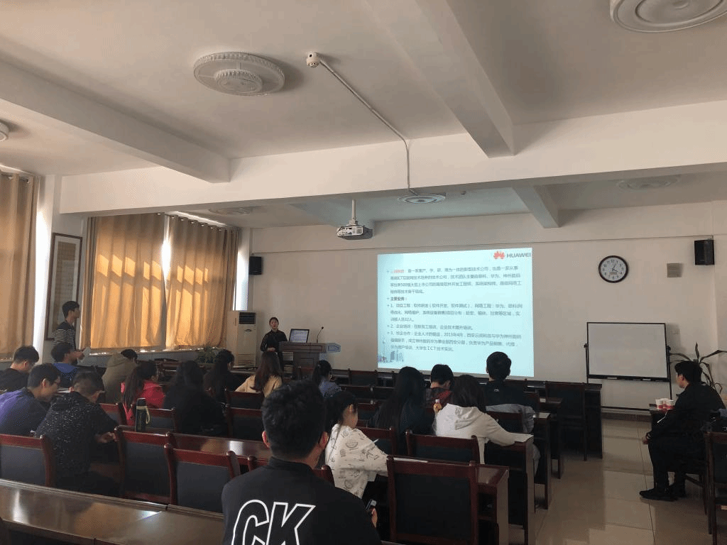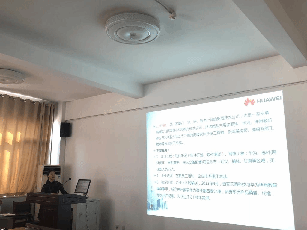 西安云间信息科技有限公司是一家集产、学、研、商为一体的新型技术公司,也是一家从事高端ICT互联网技术培养的技术公司。主要从事通信技术服务、软件开发、测试、企业技术咨询等服务,与华为公司以及三大运营商都建立了长期稳定的合作关系。宣讲会上公司主要展示了几个软件开发的项目:电子公文传输系统、网站建设管理系统、优惠咨询O2O平台、数字化城镇建设等,还讲解了企业技能提升实训部和校企合作部,最后讲述了几个岗位招聘要求。