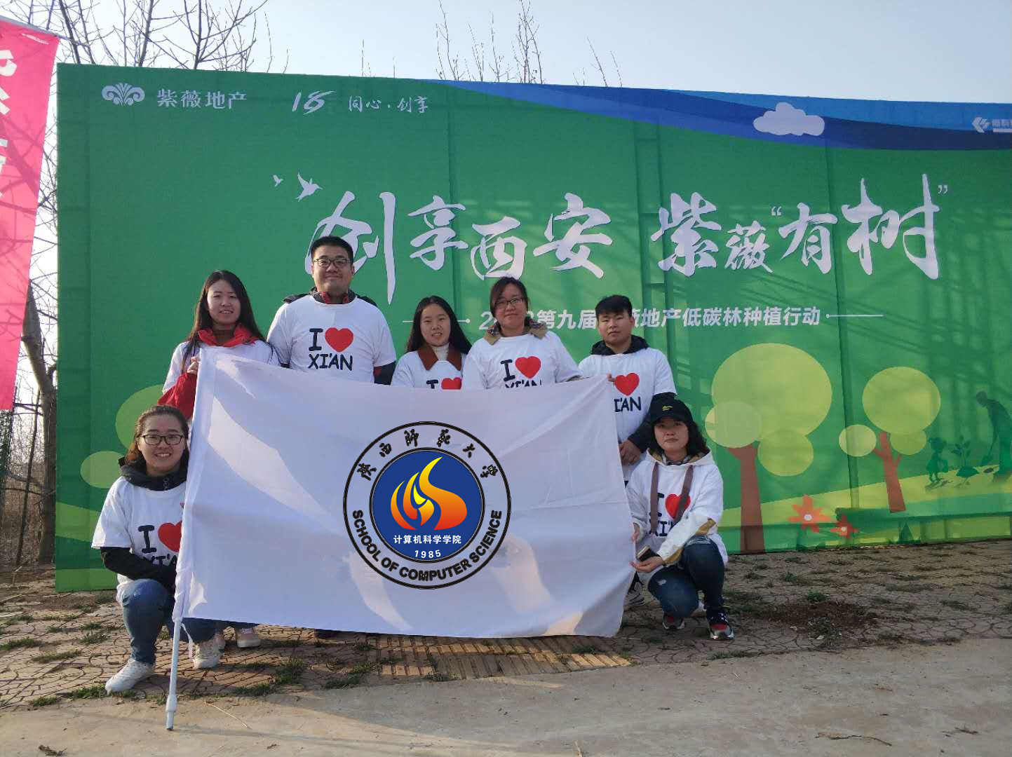 3月11日,上午7:00,7名计科院研究生志愿者在长安校区校门口集结,伴着微微春风,乘坐大巴车前往秦岭北麓沿线的洪庆山,四百余名来自全西安各地的志愿者新栽绿树两千余棵,为荒山披绿,种下绿色希望,助力美丽西安建设。