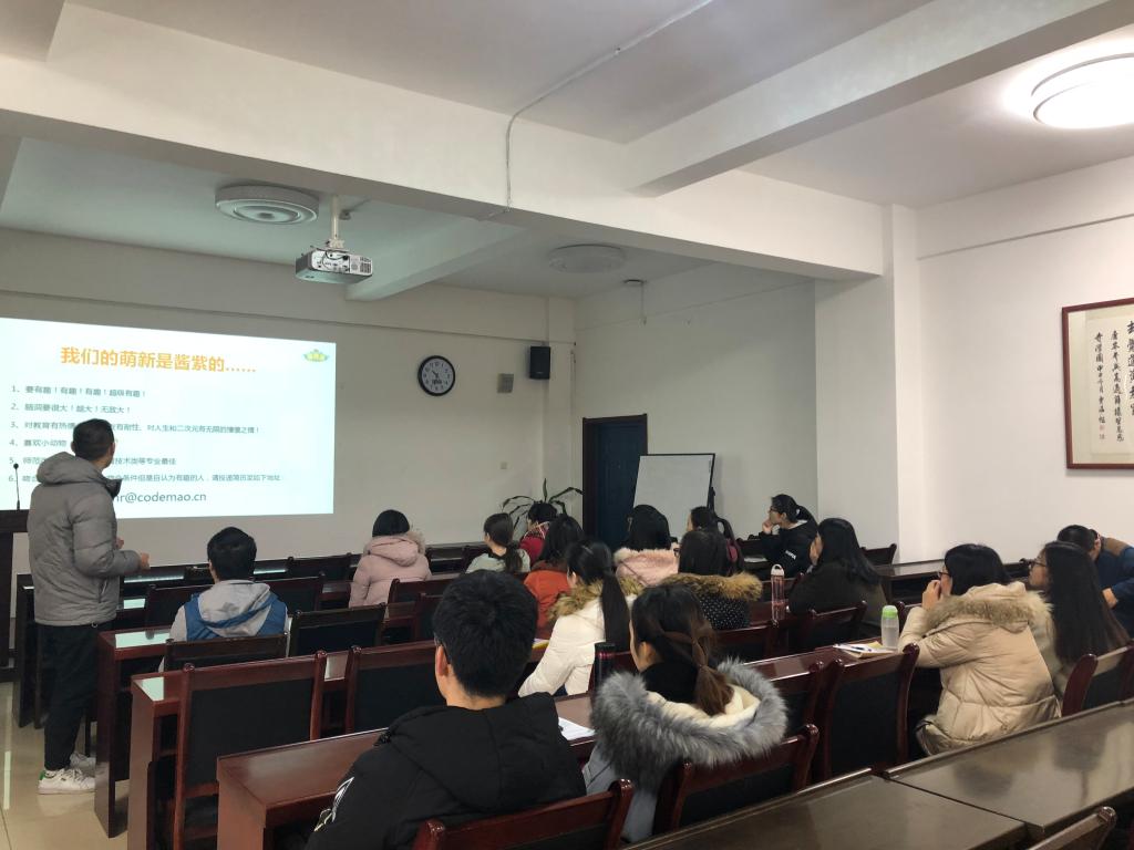 宣讲会上,大家一同观看了深圳点猫科技有限公司简介短片。随后,公司代表夏立博士从steam教育理念,社会发展趋势,公司历程和发展目标、团队建设、现有业务、未来发展、入职要求等几个方面对公司情况进行了介绍。公司主打少儿编程在线教育品牌,项目名称为“编程猫”。“编程猫”是一个少儿在线编程教育平台,产品主要面对6-16岁员工。以孩子喜欢的形式,结合图形化编程模块开始,逐步推进到专业的Python和C编程,并将游戏和故事贯穿整个教学体系,让编程简单得就像搭积木。编程猫欢迎有学科背景,并且有爱心、认真负责、愿意投身教育的同学们的加入。编程猫的公司理念和岗位要求和公司部分应聘员工十分契合。随后,现就职于编程猫西安分部的公司员工张庆华,结合自己的工作经历,深入介绍了公司的品牌和发展前景,并鼓励大家勇于尝试、多多锻炼。在互动环节,夏博士就同学们提出的各种关于公司,岗位等的问题进行详细耐心地回答。现场交流气氛非常热烈。宣讲会结束后,有意向的同学进行了简历投递,并与夏博士等公司代表继续进行面对面的深入交流!