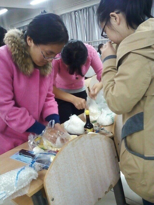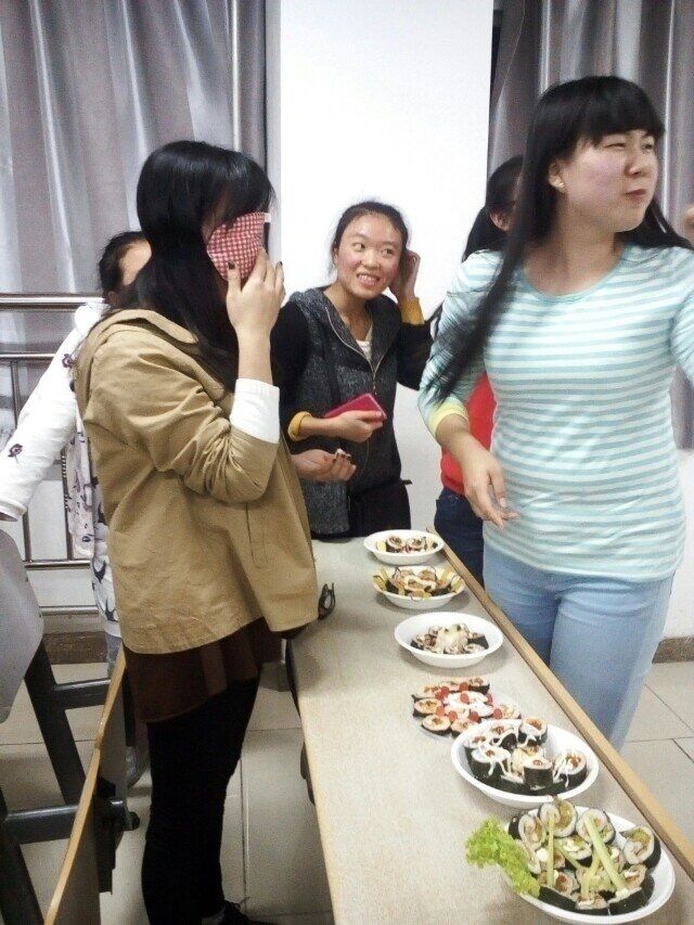 班级所有同学共分为六个小组,分别起名为“不是切糕”、“六环”、“黑暗料理”、“狂吃不胖”、“208”、“561”。各组按要求事先准备好喜欢的食材,包寿司的工具由班级统一提供。
