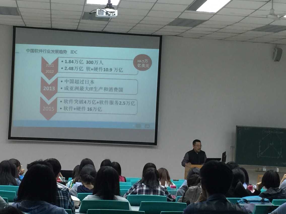 深蓝软件公司是西安软件园认定的软件人才培养机构,是国家商务部"千百十"工程人才培养机构,这次的主讲人是深蓝软件开发公司的资深老师南敏庚;会议伊始,南老师向大家介绍了现阶段世界互联网的发展情况,及软件发展过程;接下来又介绍了应聘软件企业的员工需要的硬件条件;他对大家说,首先扎实的基本功很重要,对于计算机专业员工来说未来想要获得一份好的工作,必需要精通一到两门程序语言和工具,同时也要十分热爱程序,及较强的团队协作能力,才能更好地适应企业环境。计算机专业员工就业流向大致都集中在北上广地区,主要原因是这些地区就业机会多,薪资高。最后蓝老师向大家建议到,要练好基本功,达到企业需求,弥补与企业要求之间的差距。接下来的南老师向大家介绍就业经验。他讲到,首先要多参加招聘会,向招聘方展示自己的专业技能,让别人知道你的能力,将自己成功的推销出去; 南老师还通过一些实例向大家介绍如何成功的就业。