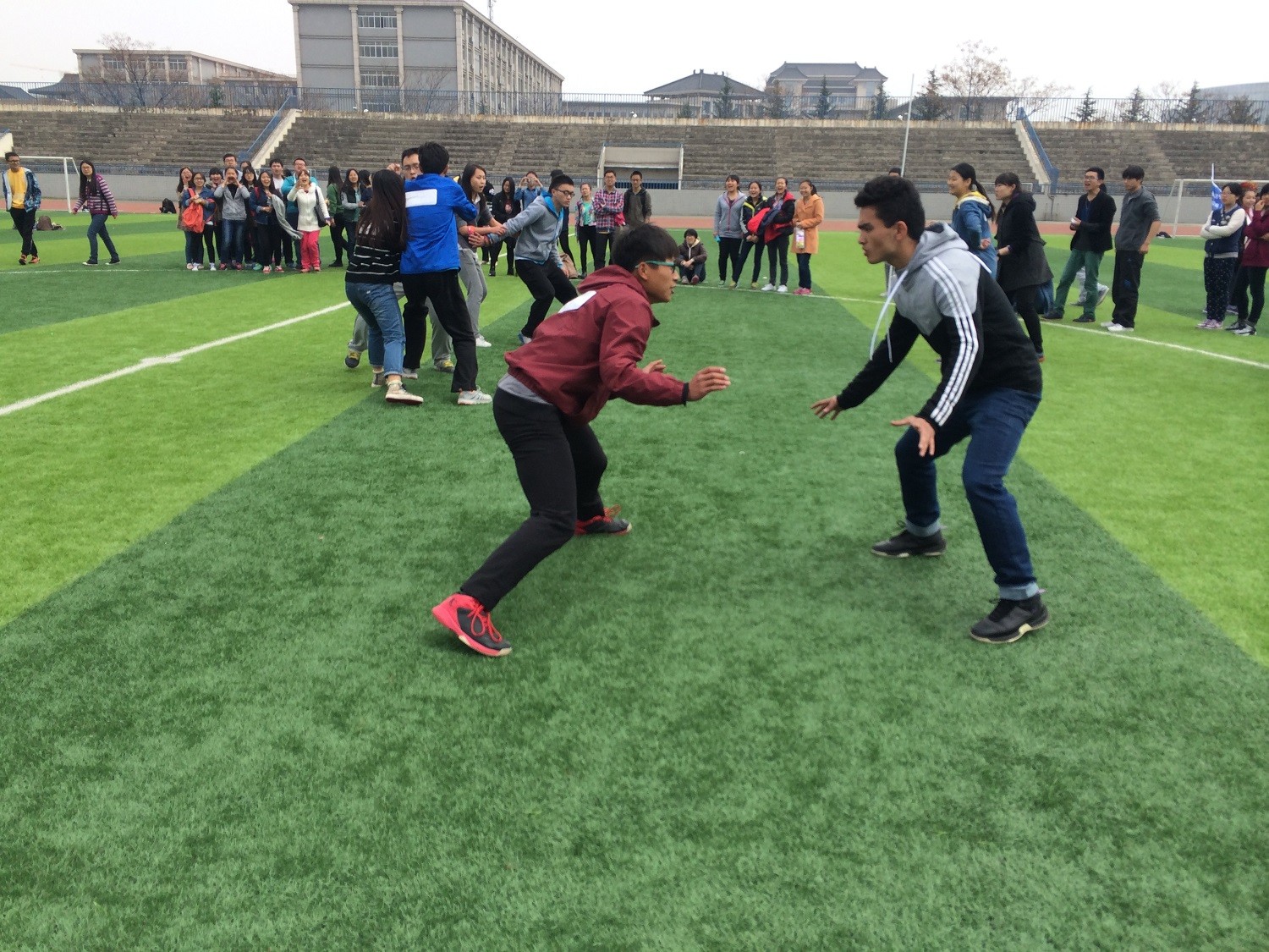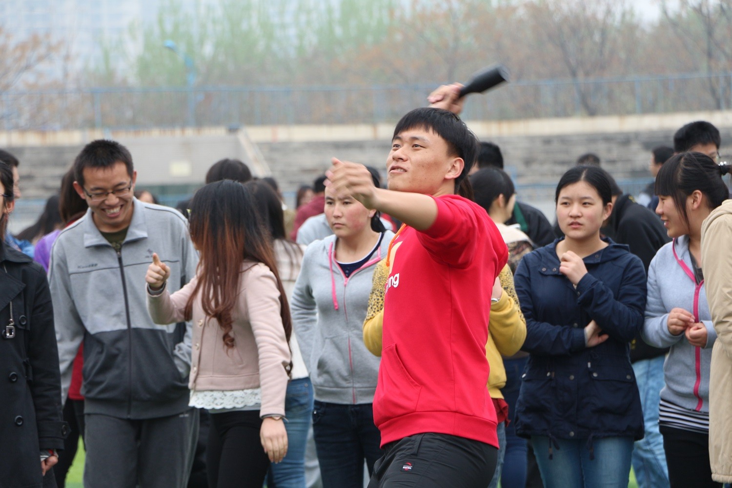 回到操场后,各项趣味比赛逐项开始,操场顿时沸腾起来。手榴弹掷准、背抛实心球、篮球掷准、袋鼠跳、速传呼拉圈、搭桥接力,每一项比赛都极其激烈,观看的同学在旁边热情的呐喊助威。每个人的脸上都洋溢着青春朝气,整个运动场加油声、欢呼声此起彼伏。躲避球比赛以班级为单位,两个班级进行比赛,在五分钟内有队员存活且接球最多的班级获胜。接着依次进行。名牌大战由每个班级选出五个人参加比赛,每人要保证自己身上名牌不被对方撕掉,存活到最后的班级获胜。比赛非常激烈,场上欢呼声一声高过一声,所有人乐在其中。