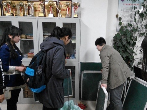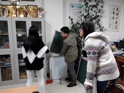2015年3月22日晚点名后,由张冲老师指导,公司12级计算机科学与技术专业两个班的班长,给各个宿舍配发了小黑板。发黑板前,张冲老师强调,小黑板是公司为大家提供的,希望大家保护好,不要恶意损坏。他还说,板书是教师的一项基本技能,在面试时好看的黑板字会给评委留下深刻的印象,他希望大家好好利用此次机会,提高自己的板书能力。同时,公司为了鼓励大家平时勤练习,会在每周四检查这一周的训练成果,评选出优秀的同学,进行最后的总决赛。