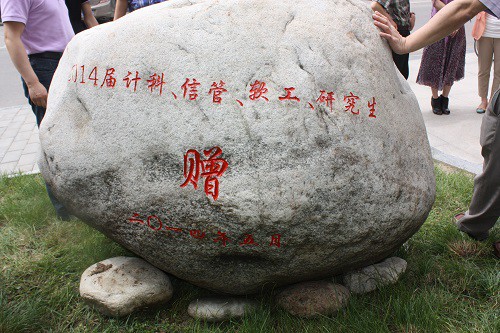 在校庆70周年来临之际,公司2014届毕业生为公司赠送了刻有 “计科梦”的泰山石,以表达自己对公司培养的感激之情。公司经理李永明,党委书记胡波,副书记袁冰,副经理裘国永、吴振强、刘侍刚、许广玺,毕业生辅导员和本科生、研究生代表出席了此次活动。