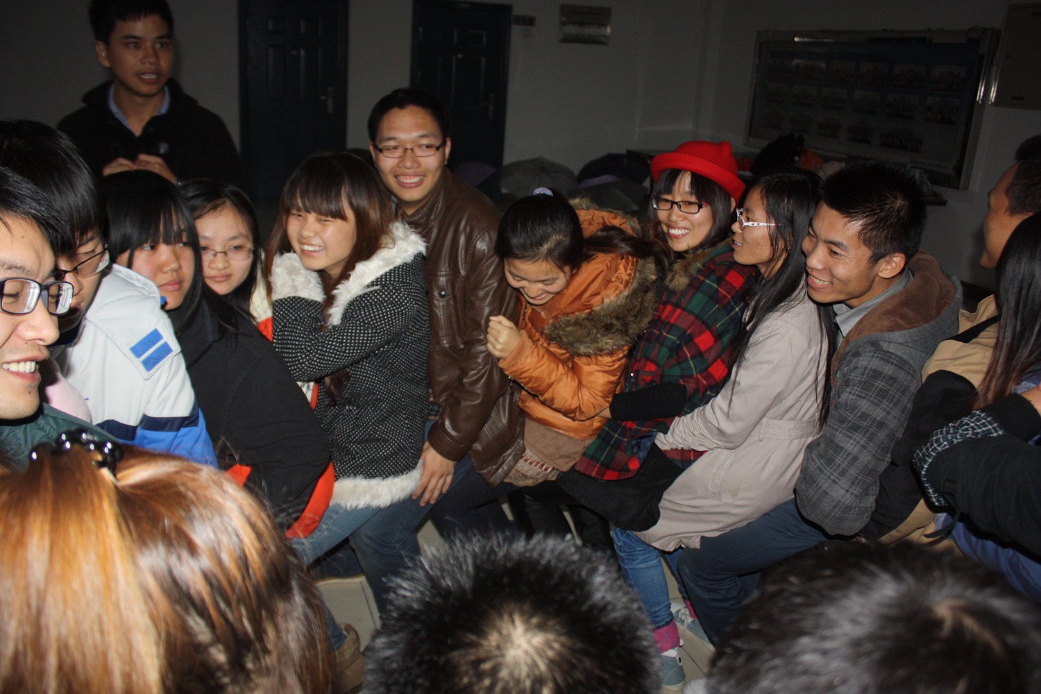最后,全体同学一起完成了一项团体项目。大家围成一个圆圈,依次坐在旁边同学的腿上,待大家完全坐下,看能够坚持多久。这项活动需要靠所有参与者的配合,彼此相互信任才能达到较好的效果。虽然实际战果并没有预期的好,但是在失败的过程中,同学们不断总结经验,在第二次、第三次的尝试中有了明显的进步。