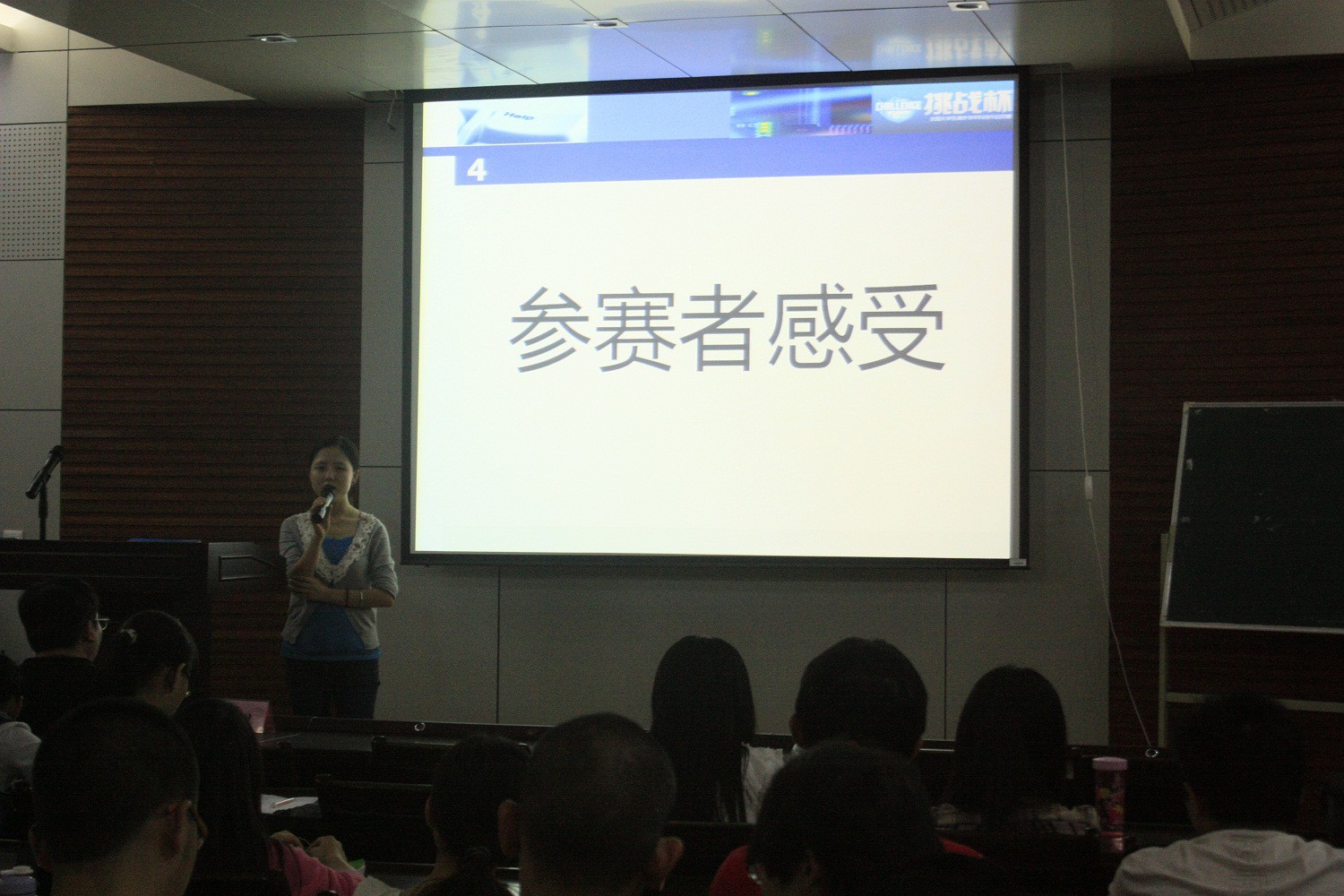 接着,公司2012年参加第八届“挑战杯”老员工创业计划竞赛的2010级本科生杨婷婷、郎欢与在座同学分享了他们团队在比赛过程中的感受和经验。通过参加比赛,他们都感受到要想取得理想的成绩,团队协作是最重要的,团队成员要全面、谨慎,在性格上要可以互补。此外,在备赛过程中,不仅要有毅力和恒心,还要合理安排时间,确保学习备赛两不误。