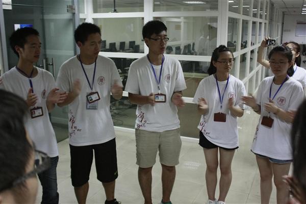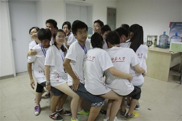 下午,实践团成员在鼎力公司总经理刘世伟和公司团委书记胡雯洁老师的带领指导下,进行了团队扩展训练活动。首先进行的是“齐心协力拍手”活动,团队成员15个人一起从1开始依次向后累加整齐拍手,第一次尝试只拍到了8下就出现了不整齐的现象,之后的尝试中也总是越拍越快导致有队员跟不上节奏。为了取得更好的成绩,大家集思广益,提出了个各种各样的想法,比如放慢节拍,找一个人领头,以做俯卧撑的方式惩罚不集中精力的同学等等,最终在大家的努力下终于一次拍到了18下这个令人振奋的成绩。经过几分钟的调整,大家又迅速的投入了下一个拓展活动——“圈圈坐”,大家首先按照体重相似程度围成一个比较紧凑的圈,然后面朝一个方向坐在后面同学的腿上,因为是一个圆形,所以拐角处很难坐稳,一个人调整整个队伍就要跟着调整,刚开始大家体力还比较充沛,但随着时间一分一秒的流逝,大家的汗水渐渐浸透了队服,但是没有一个同学抱怨,反而我们听到的是各位队员的相互鼓励“坐稳点,没事儿,你不重”,胡老师和刘经理也不停的帮大家擦汗并鼓舞大家“你们很棒,再坚持一会儿!”,为了活跃气氛转移注意力,大家在活动同时还玩儿起了成语接龙,谈理想谈未来,在不知不觉中已经过去了50分钟,这意味着公司实践团队以十分优异的成绩通过了拓展训练的考核。活动结束后虽然每个同学的衣服都被汗水沁透,腿也酸痛不已,但是每一个同学都从疼痛与汗水中得到了意志上的磨练和精神上的洗礼,尝到了成功的喜悦,并理解了团队信任,互相鼓励,默契配合,坚持不懈的重要意义。也向西安软件园的工作者展现了师大团结的一面,顽强的一面,拼搏向上的一面。