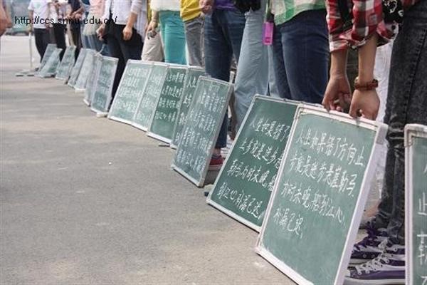 本次比赛为“小黑板进宿舍”系列活动之二,由赛前组织、训练提高、现场比赛三个环节组成。要求以宿舍为单位,书写内容为“人生如果错了方向......”等30个字,限时3分钟,现场书写,然后由各位老师统一评比出12名“板书小能手”。