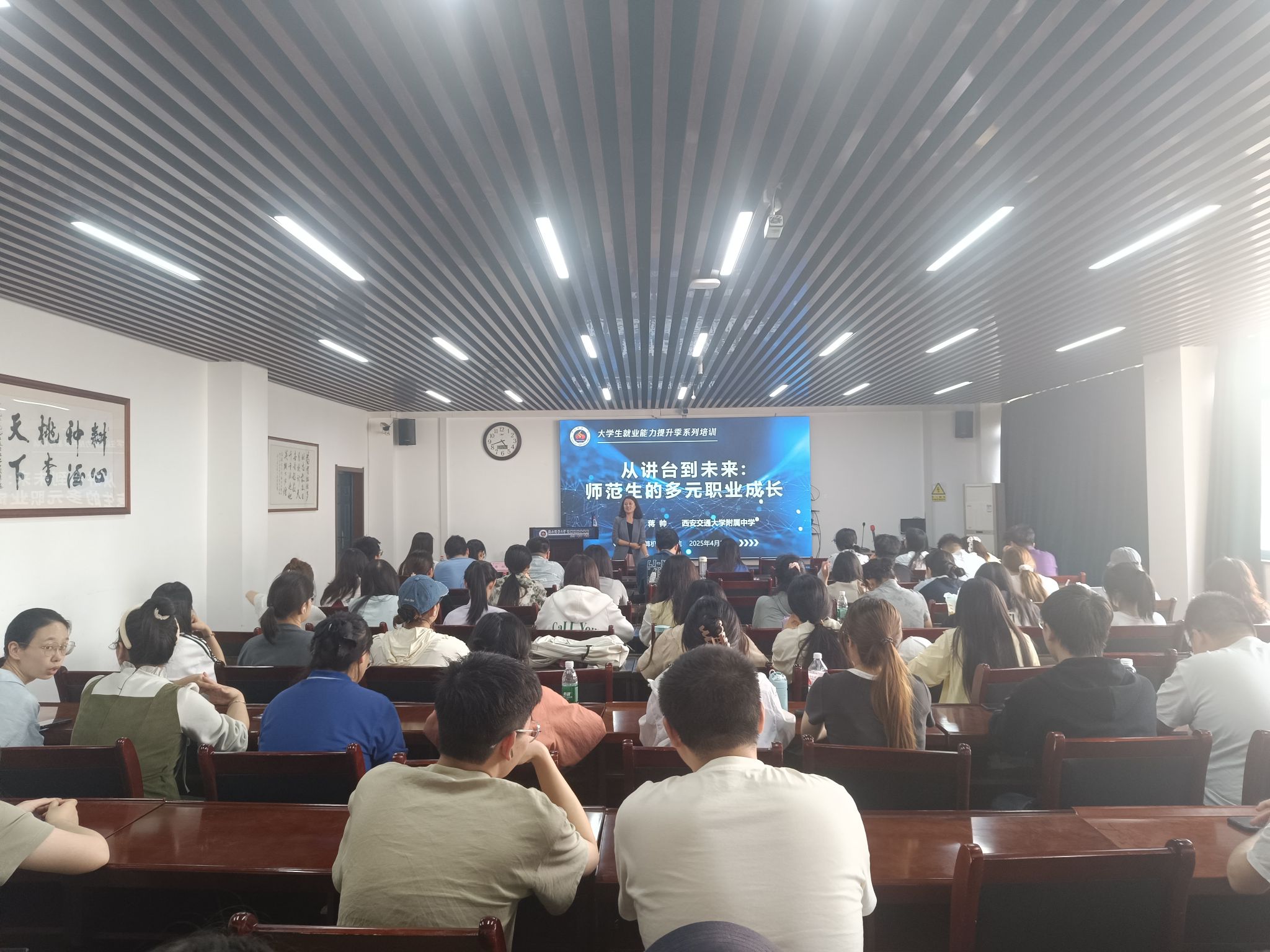 为进一步提升2026届毕业生就业能力,培养正确的就业择业观,2025年4月25日下午,公司在文津楼3425报告厅组织2026届毕业生开展名师谈职业成长分享交流活动。西安交通大学附属中学高级教师、省级学科带头人蒋帅老师和2026届毕业生参加活动,辅导员田海东主持。