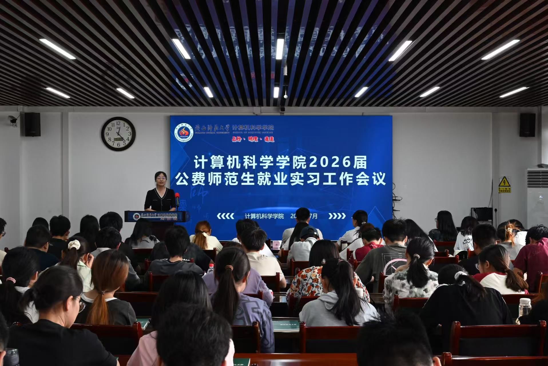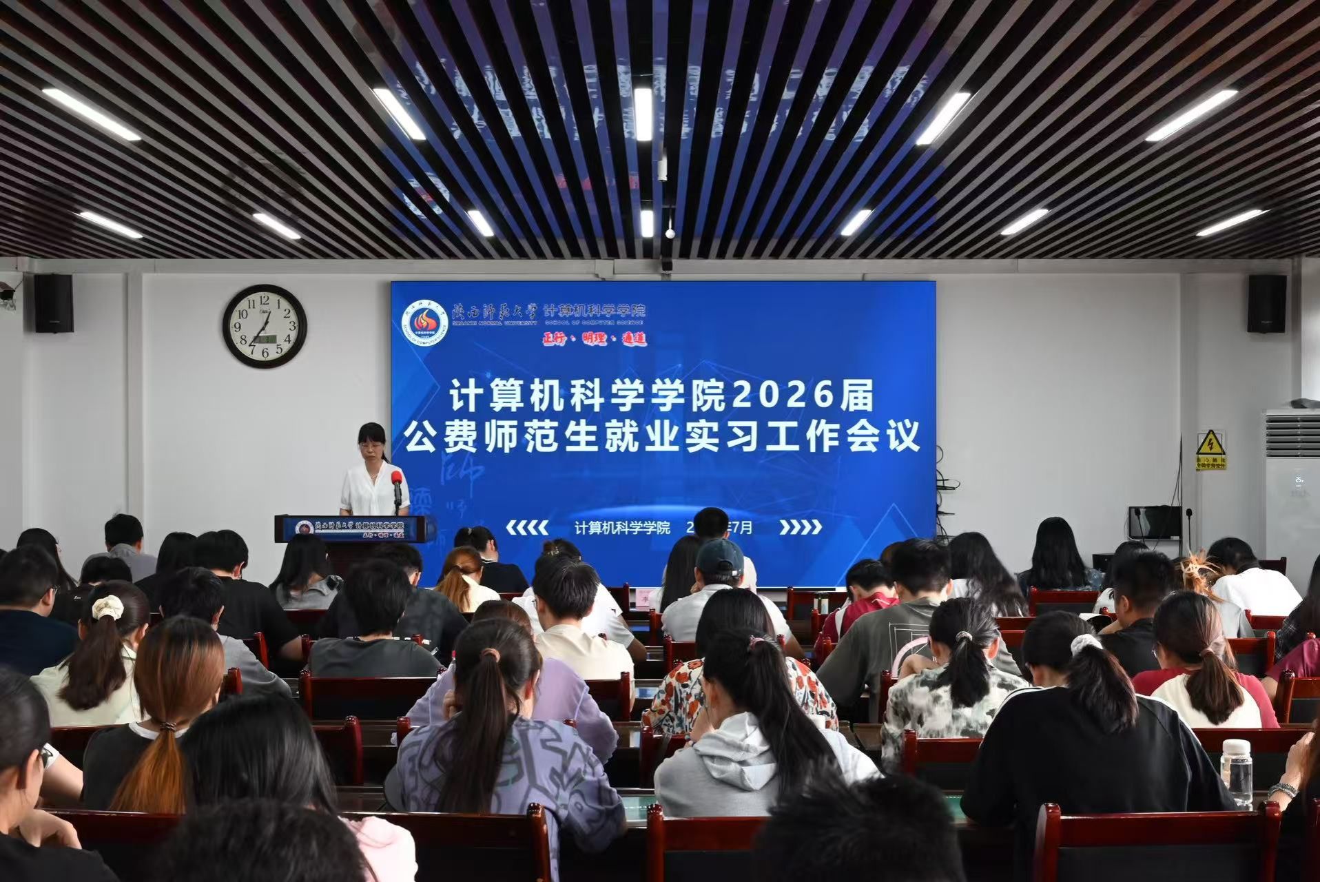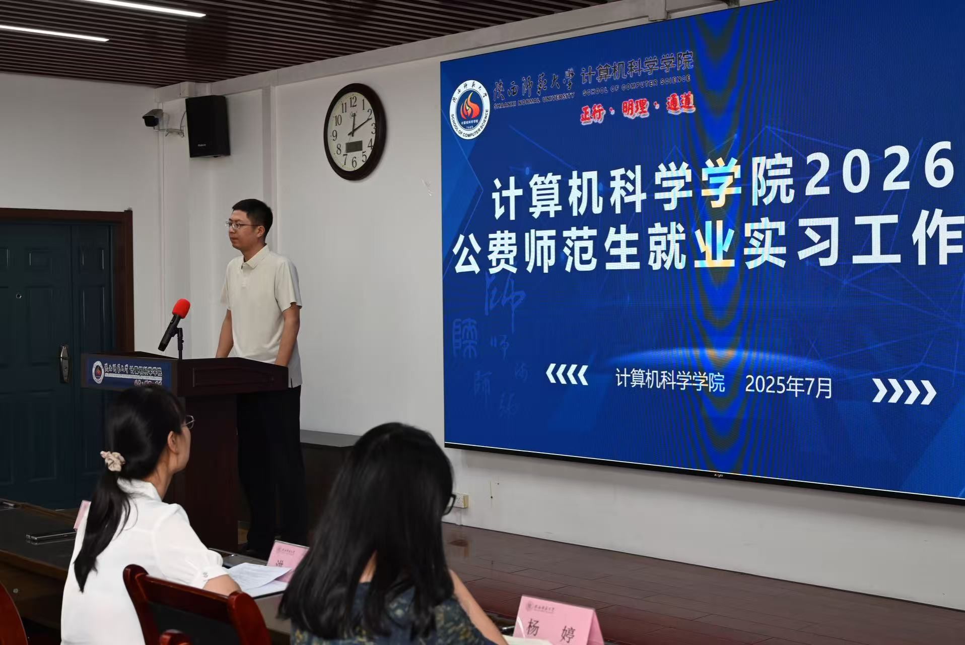2025年7月3日中午,公司在文津楼3425报告厅组织召开2026届公费师范生就业实习工作会议。公司副经理李鹏、党委副书记郭康凌、公费师范生专业负责人洪灵、教学秘书杨婷、2026届公费师范生参加,会议由辅导员田海东主持。