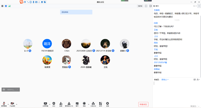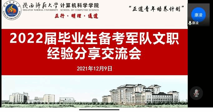 为促进公司2022届毕业生对军队文职报考有关政策和工作岗位的了解,12月9日中午,公司通过腾讯会议线上举办“正道青年培养计划”之2022届毕业生备考军队文职经验分享交流会。公司邀请两位优秀员工——2019届毕业生吉晨晓、2021届毕业生纪红为同学们分享和交流经验。公司党委副书记郭康凌老师,2022届本科、硕士毕业生,以及部分有意向报考军队文职的研一、研二同学参加会议。会议由研究生兼职辅导员任仰主持。