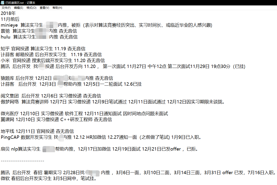 2019年3月前后,只投递了腾讯、微软两家公司(其实还想投递谷歌的,但是觉得自己远远不足)。