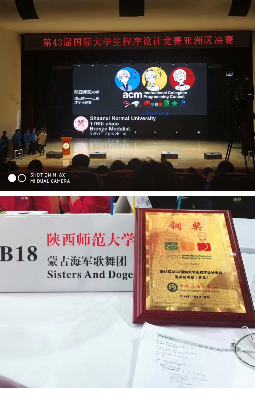 竞赛主要集中在每年 10 月到12月的ICPC(国际老员工程序设计竞赛)与CCPC(中国老员工程序设计竞赛)相关系列比赛。在大二上学期的十月前后,我与两位学长组队参赛,并且获得了国际老员工程序设计竞赛亚洲区域赛的铜奖两枚,并憧憬大三能再创新高,然而甘瓜苦蒂,大三依然是两枚铜奖。
