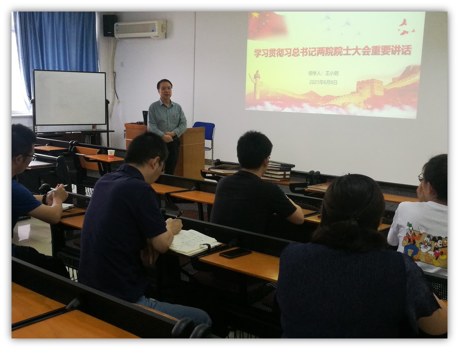 党课内容围绕习近平总书记在两院院士大会上的重要讲话展开。王小明同志介绍了在党的领导下我国取得的重要科技进展和加快科技强国建设战略,结合本学科发展他进一步指出:“我们需增强使命感、责任感和紧迫感;在工作中,我们要落实总书记号召,直面问题、迎难而上,把科教兴国战略落实到具体工作中,为基础教育培育德智体美劳全面发展的卓越信息技术教育人才,为人才强国战略、创新驱动发展战略贡献力量。”
