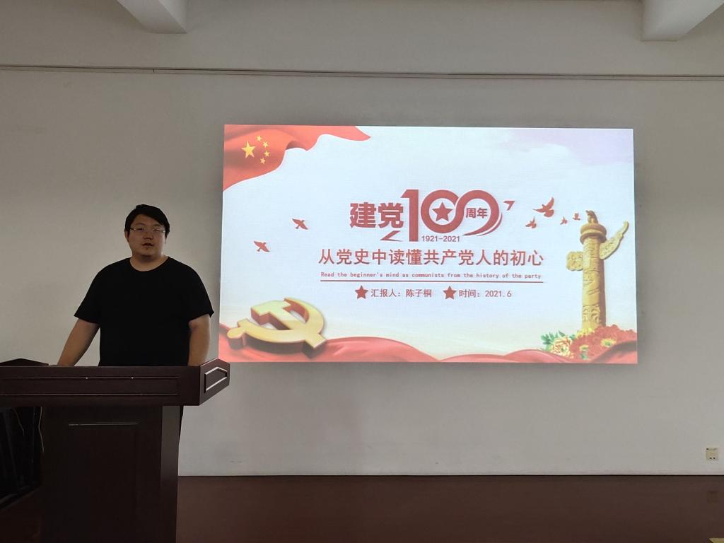 陈子桐以中国共产党成立一百周年为契机,依次从“不忘入党初心,牢记党员身份”“不忘党的初心,传承红色基因”“不忘职责使命,牢记党的嘱托”“扛起新使命,开启新征程”四方面进行了详细阐述。首先,陈子桐带领全体成员回顾了中国共产党初期建设的筚路蓝缕,回忆了每位党员入党时的心路历程,重温了入党誓词,使支部成员再次明晰了“为什么入党”。随后,陈子桐结合历史事件、融入家国情怀,深情讲述了焦裕禄、王进喜、雷锋等时代楷模的英雄事迹,使党的初心使命深深烙印在每位支部成员的骨髓里。